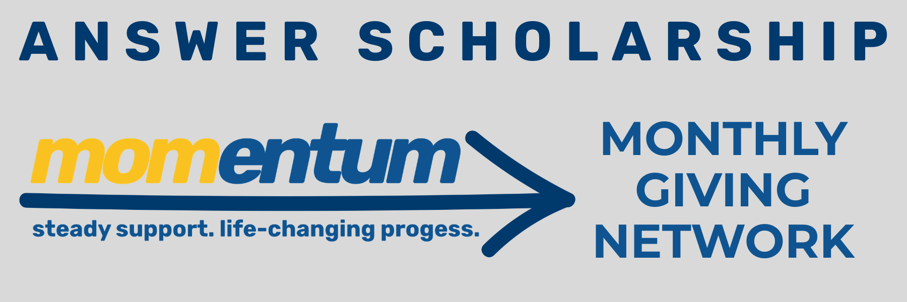 When a mom decides to pursue her degree, she’s doing more than going back to school — she’s changing the future of her family. Momentum is ANSWER’s community of monthly supporters who provide the steady, reliable support that keeps our scholars moving forward. Your monthly gift helps remove everyday barriers, strengthen our programs, and ensure that when challenges arise, a mom has the support she needs to keep going.